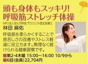 認定指導士の林田麻佑さんの呼吸ストレッチ体操の講座がNHK文化センター神戸教室で開催されます!関西方面の方はぜひご参加ください。
